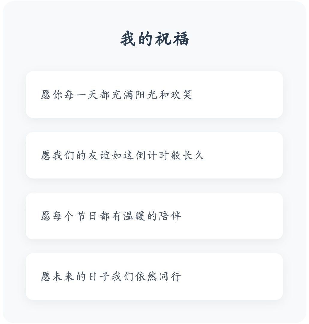 每一个节日和纪念日都是时间的标记,提醒我们珍惜当下,期待未来。我为你准备了这些特殊日子的倒计时,希望它们能成为我们友谊路上的美好期待。